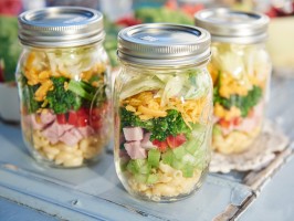 To assemble: In eight 16-ounce mason jars, layer 1/3 cup each of the following ingredients in this order: macaroni, ham, celery, bell pepper, broccolini, Cheddar and lettuce. Seal the jar with a tight-fitting lid. Your salad may be stored in the refrigerator, or "icebox," overnight. Serve with the dressing on top, or on the side. Then toss to combine.