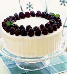Cut cake horizontally into 3 equal layers. Place bottom layer, cut side up, on platter. Spread 1 cup frosting over. Spread half of filling (about 3/4 cup) over frosting, leaving 1/4-inch plain border at edge. Top with second cake layer and 1 cup frosting, then remaining filling. Top with third cake layer, cut side down. Spread remaining frosting over top and sides of cake. Refrigerate until frosting sets, about 1 hour. DO AHEAD Can be made 1 day ahead. Cover loosely; keep chilled until 1 hour before serving. Garnish cake with 1/2 pint berries.