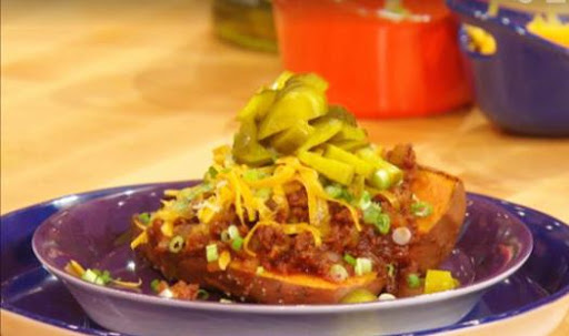 Top the baked potatoes or halved potatoes with sloppy sauce and cheese, scallions and pickles to garnish and serve. Eat the skins -- they are full of good nutrition!