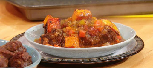 Once the squash is done, remove bay leaf and orange rind from the stew. Skim fat with a spoon or paper towels.