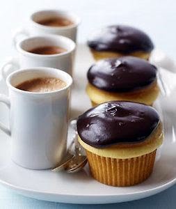 8. To assemble: Slice off top of cupcakes to come to top of paper liners. Spread cut surface with about 1 Tbsp filling. Top with cupcake top. Spoon about 1 Tbsp glaze onto top center of each, easing it over top.