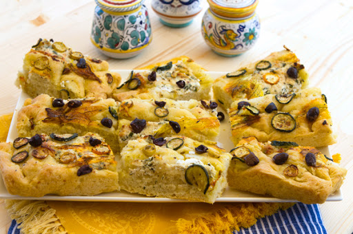 Focaccia With Zucchini, Zucchini Blossoms, Ricotta Cheese & Olives