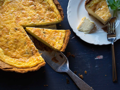 3 Make the filling: Reduce the oven temperature to 300°. In a blender, combine the cream with the milk, flour, eggs and yolks, salt, and pepper, purée until smooth then pour the custard through a fine sieve set over a bowl. Dot the cooled tart shell with the cheese, pour the custard over the cheese, and bake the quiche until set and lightly browned on top, about 1 1⁄2 hours. Transfer to a rack and let cool to room temperature before serving.