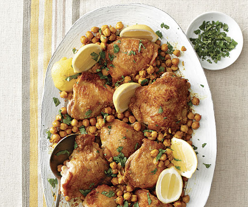 4. Stir in the broth, scraping up any browned bits. Add the chickpeas and bring to a simmer. Return the thighs to the skillet, skin side up. Transfer to the oven and roast until the chicken cooks through, 20 to 25 minutes. Top with the cilantro and serve with lemon wedges.