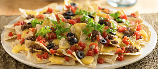 Piled high with ground beef, lettuce, olives, tomatoes and chilies, these nachos are a must-have for your hoops party.