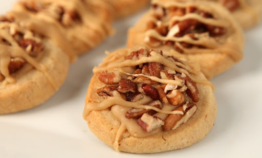 Place a small amount of frosting in the center of each cookie, immediately press onto chopped pecans and return to rack. When you have finished adding nuts to all your cookies, add a few drops of water to remaining frosting to thin out to drizzling consistency. Using a whisk or fork, drizzle the frosting back and forth across the cookies. Extra will drip onto wax paper below which can be scraped back into the bowl if needed.