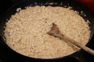 6. Add milk and then place in oven. Bake 1 – 1-1/2 hour until most of liquid has thickened begins to form slight crust and perhaps just beginning to brown.