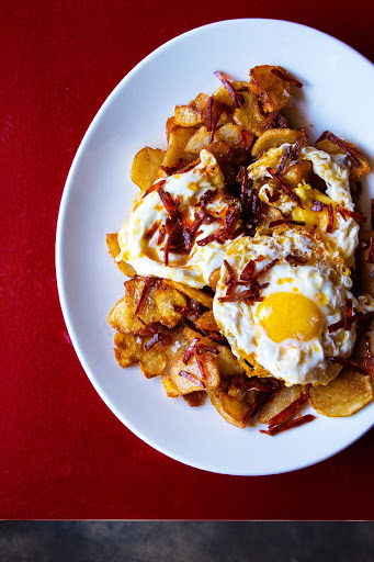 4. Return the heat to medium high and crack the eggs into the pan of chorizo oil. Season with salt and cook until the whites have set but the yolks are still runny, 3 to 4 minutes. Transfer the eggs to top the potatoes and chorizo, then serve immediately.