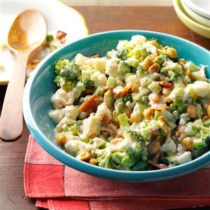 In a large bowl, combine the first five ingredients. In a small bowl, mix mayonnaise, sugar, cheese, vinegar and salt until blended. Add to salad and toss to coat. Just before serving, stir in peanuts. Refrigerate leftovers. Yield: 12 servings (3/4 cup each).