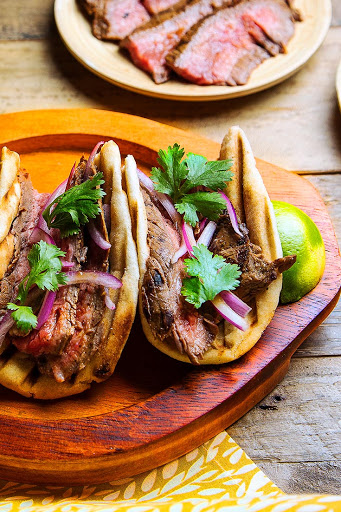 4. Serve the steak with pieces of grilled naan, sliced red onion and lime wedges, garnishing with cilantro leaves.