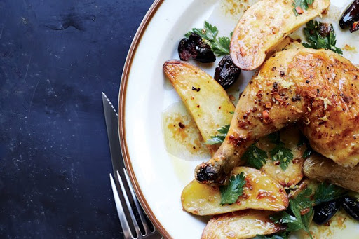 4. Arrange potato mixture around chicken. Roast until potatoes are fork-tender, chicken is cooked through, and skin is crisp, 35-45 minutes. Serve chicken and potato mixture topped with parsley, lemon zest, and more red pepper flakes, if desired; spoon pan juices around.