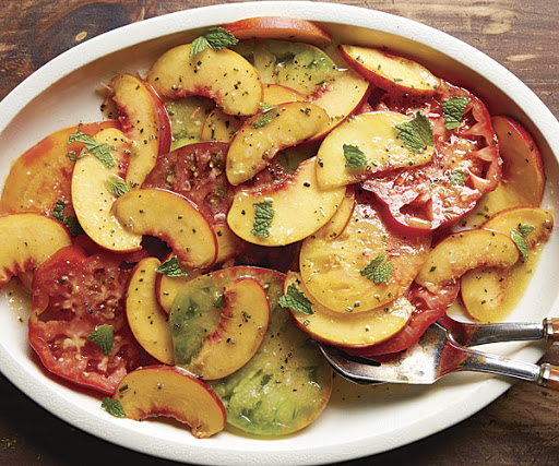 In a small bowl, whisk together the reserved marinade and the Dijon; it’s OK if it doesn’t emulsify. Arrange the tomato slices on 4 plates or a platter, top with the peaches, and drizzle some of the vinaigrette over the top. Season lightly with salt and pepper and garnish with the mint. Pass any remaining vinaigrette at the table.