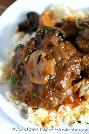 Layer beef patties over mushrooms. Combine remaining ingredients except water and cornstarch. Pour over beef and cook on low 5 hours.
