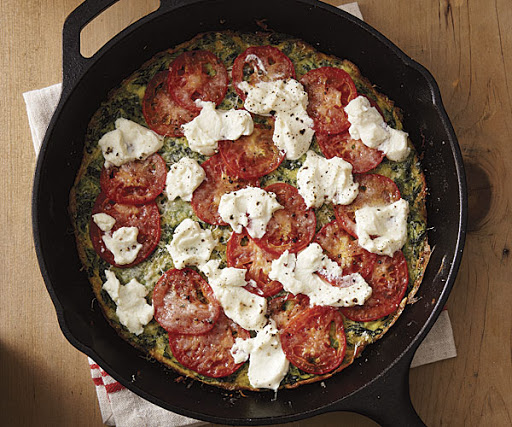 3. Melt the butter in a 10-inch oven-safe nonstick skillet over medium-low heat. Add the onion and cook, stirring occasionally, until translucent, about 3 minutes. Add the egg mixture and cook until the eggs begin to set, occasionally lifting the sides with a spatula to let uncooked egg run underneath, 3 to 5 minutes. Lay the tomato slices over the eggs and dollop the ricotta around the tomatoes. Sprinkle with 1/4 tsp. salt and a few grinds of pepper and then the remaining 1/4 cup of the Parmigiano. Bake until the ricotta is heated through, about 10 minutes. Let cool slightly before slicing and serving.