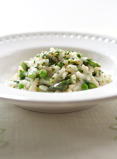We wanted a risotto primavera with fresh yet complex flavors and vegetables that retained some bite. We started with the classic combination of asparagus and leeks. The leeks melted down beautifully as their delicate flavor infused the rice. The asparagus had to be handled separately; sautéing the trimmed spears and stirring them into the rice right before serving kept them from turning into mush. For a third vegetable, we added frozen peas. For a stronger backbone of flavor, we simmered the leek greens and tough stems of the asparagus in the chicken broth we used for cooking the rice. To round out and brighten the dish, we topped it with a gremolata of parsley, mint, and lemon zest.
