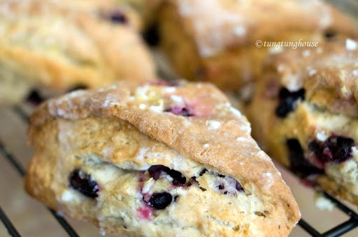 Preheat the oven to 400 degrees F. Mix together the flour, baking powder, salt, and sugar in a stand-mixer bowl. With medium-low spend, put the butter in and blend to coat the dices with the flour until the mixture turn into coarse crumbs. Then pour in the almond milk and mix everything together just to incorporate. Do not over-mix the dough. Gently fold the blueberries into the batter. Don't mash the blueberries.