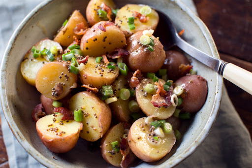Add mustard seeds to bacon fat in pan. After a few moments, they will begin to pop. Immediately turn off heat, and add vinegar and potato mixture. Toss together, then transfer back into bowl.