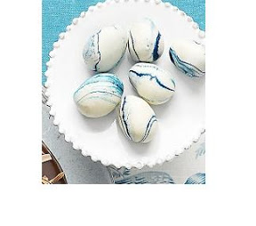 6. Working with one at a time, dip half of the eggs in blue chocolate, then dip remaining eggs in swirled chocolate, letting excess chocolate drip back into bowl. As you work, transfer eggs to a baking sheet lined with parchment paper; refrigerate until set, about 1 hour. Truffles can be refrigerated in an airtight container up to 2 weeks.