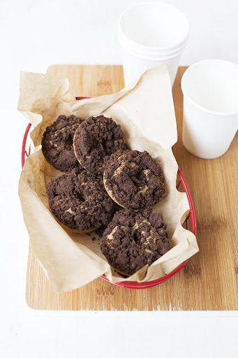 Stir together all the ingredients for the streusel into a clumpy mass, and scatter evenly over all the donuts.