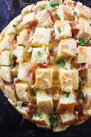 Gently pry apart the bread and stuff the bacon into the crevices. Next, stuff the shredded cheese into the crevices, making sure all of the bread is evenly stuffed with bacon and cheese. There is a lot of cheese, but keep stuffing! It will all fit. Sprinkle the green onions over the top, pushing them gently into the bread.