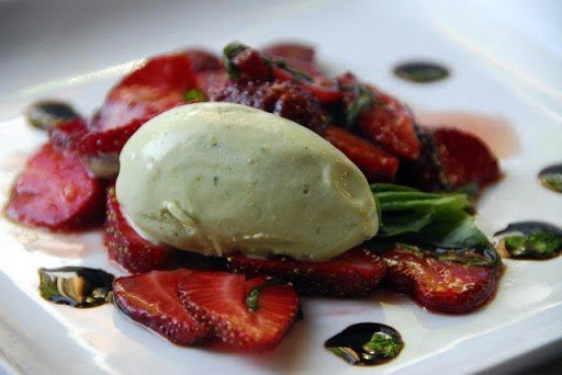 Warm the other half of the basil mixture with the milk and salt. While the milk is warming up break up the yolks with a whisk. When the milk start simmering, turn the heat off, and pour it slowly into the yolks whisking to temper them until they thicken into a custard. Strain the yolk custard into the reserved cream-basil mixture, mix well, add the lemon zest and chill completely. Freeze the ice cream base in your ice cream maker according to the manufacturer's instructions.