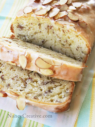 Blend powdered sugar and melted butter together; then add lemon juice and mix until well blended. Spoon glaze over cooled loaf; then sprinkle with sliced almonds. Let glaze set.