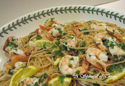 Meanwhile, in another large (12-inch), heavy-bottomed pan, melt the butter and olive oil over medium-low heat. Add the garlic. Saute for 1 minute. Be careful, the garlic burns easily! Add the shrimp, 1 1/2 teaspoons of salt, and the pepper and saute until the shrimp have just turned pink, about 5 minutes, stirring often. Remove from the heat, add the parsley, lemon zest, lemon juice, lemon slices, and red pepper flakes. Toss to combine.