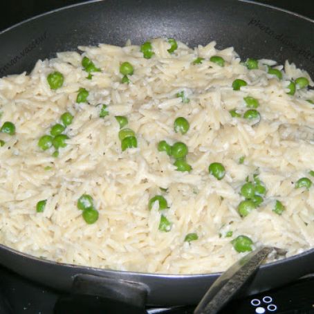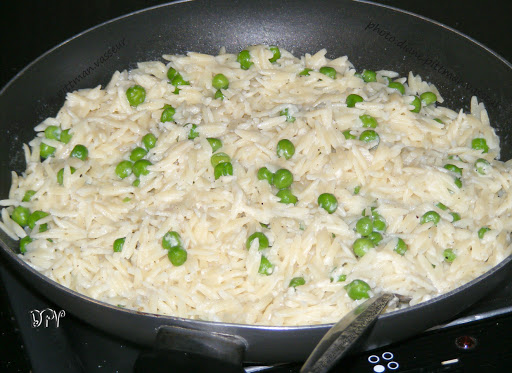 Bring chicken broth, water, and 1/2 teaspoon salt to a boil; add orzo and cook until al dente. Add the frozen peas to the pasta and cook for 1-2 more minutes. Drain in a colander.