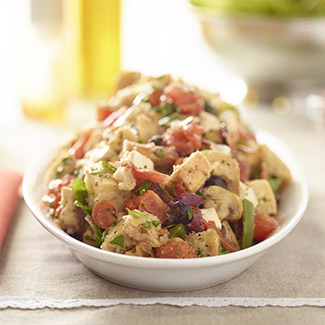 In the mixing bowl with the vinaigrette, add the bread, tomatoes, peppers, mushrooms, onions, pepperoni, olives, mozzarella, basil, and parsley. Fold the ingredients together. Let the salad marinate for 20–30 minutes, mixing every 5 minutes.