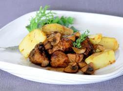 Add the meat to the potatoes with the mushrooms cut in four and let it brown for 5 minutes. Add the marinade now and cook everything for 25 minutes.