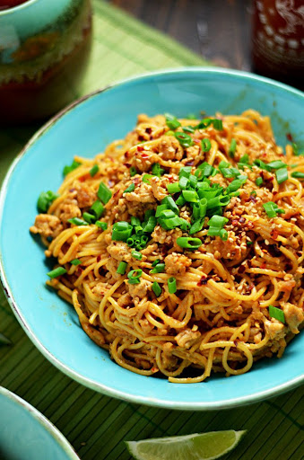 While the chicken and pasta are still warm, toss them with the tahini sauce mixture. Sprinkle in the sesame seeds and red pepper flakes and mix well. Top with green onion and serve warm or at room temperature.