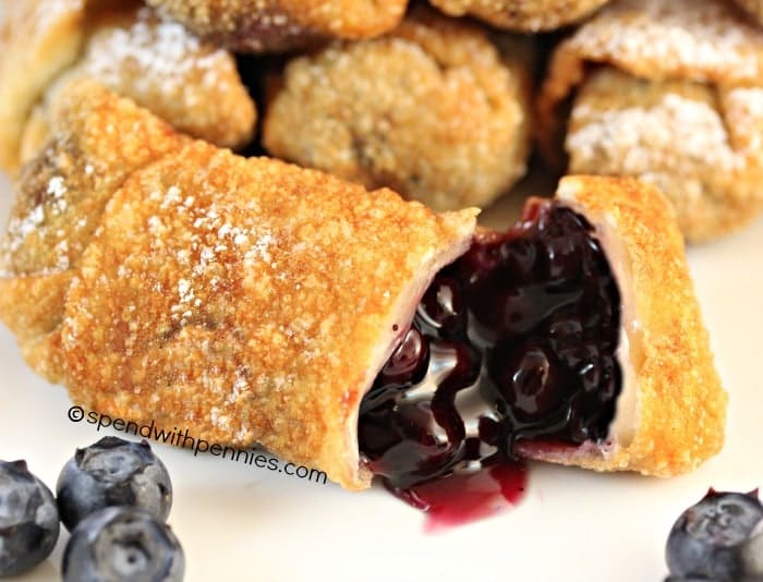 Lay one wrapper out with a corner facing you. Place 1 heaping tablespoon of pie filling and 1 tablespoon of fresh/frozen blueberries in the center of each wrapper.