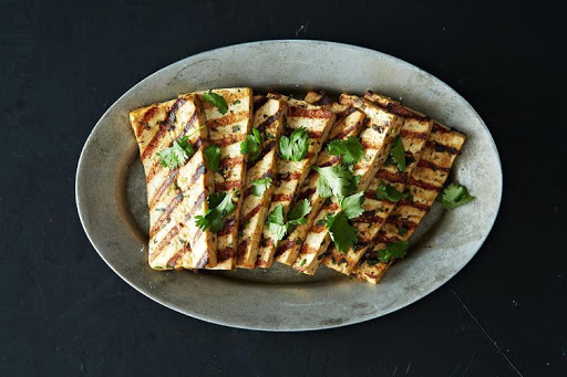 1. Drain tofu, wrap in a layer of paper towels, and press for at least 15 minutes. If you're using skewers, begin soaking them. If you don't already have your grill going, get it started!