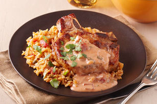 Add rice to skillet; cook and stir 1 min. Add water; bring to boil. Cover; simmer on medium-low heat 15 min. or until most of liquid is absorbed. Stir in half each of the salsa and Velveeta; top with chops. Simmer, covered, 5 min. or until liquid is absorbed. Meanwhile, microwave remaining salsa and Velveeta in microwaveable bowl on HIGH 30 to 40 sec. or until Velveeta is melted; stir until blended.