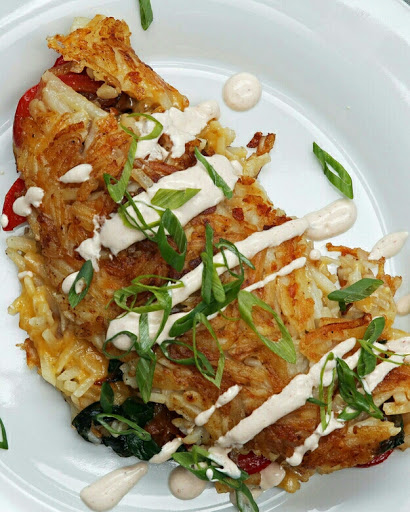 Put your pan back on the heat and add one Tbsp. of butter, melting on medium heat. Add your hash browns and season with salt and pepper to taste, stirring until the butter and seasoning are evenly distributed. Arrange the potatoes in a flat even layer. Sprinkle cheese evenly on top and allow it to melt. Then, sprinkle the filling evenly on top. When the bottom of the hash browns has crisped up and browned, your hash brown omelette is ready. Shake the pan to make sure it’s not sticking to the bottom, then bring it over to your plate and carefully tilt the pan, using the edge to help fold it over in half. Add your favorite toppings and enjoy! (We used chopped scallions and a chipotle sour cream.)
