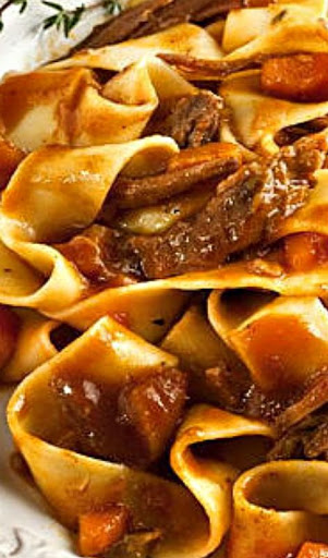 Heat a large pot of salted water. Cook noodles until tender but firm. Drain. Add noodles to meat and sauce. Toss gently. Enjoy.