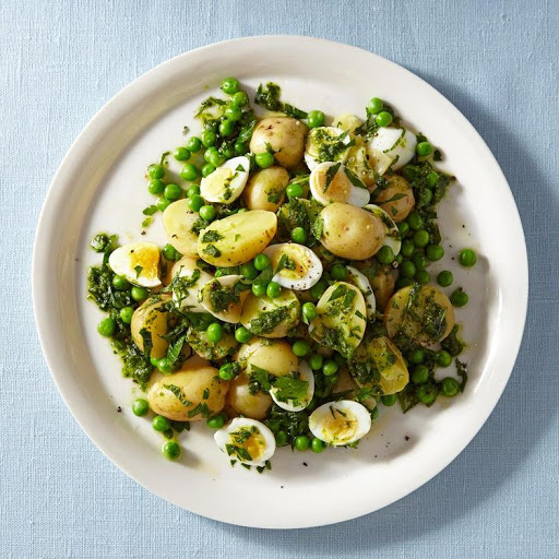 Halve hot potatoes and transfer to a large bowl. Add pesto, white wine vinegar, mint or sorrel leaves and blanched peas. Mix well, crushing potatoes slightly. Taste and season as needed with salt and plenty of black pepper. Halve eggs, gently fold them into salad and garnish with more chopped parsley. Serve warm or at room temperature.