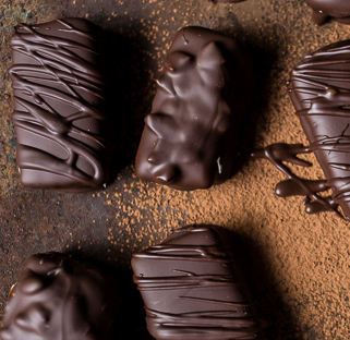 5. For the coating, place the chocolate and coconut oil in a heat-proof bowl and melt together in the microwave on High (100%) in 30-second bursts, stirring well after each burst. Once the chocolate is mostly melted, remove and stir gently until smooth. You may also melt the chocolate on the stove over a double broiler.