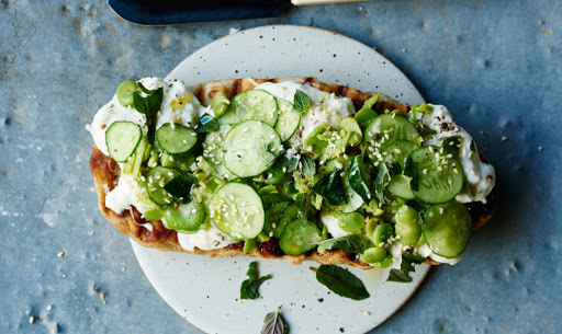 Flatbread with Fava Beans, Cucumbers, and Burrata