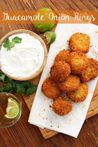 In a large saucepan, heat oil to 350˚F (180˚C). Fry guacamole onion rings in batches until nicely browned on all sides. Place on paper towel–lined plate to drain off any excess oil. Sprinkle with salt and lime juice. Serve with sour cream.