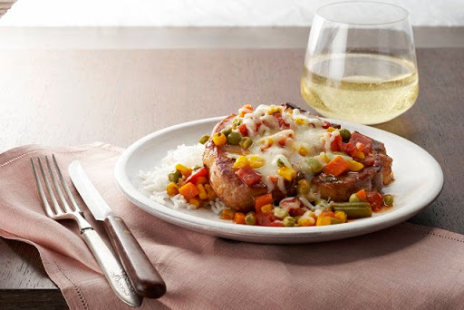 Top with oregano, dressing and tomatoes. Bring to boil; cover. Simmer on low heat 12 min. or until chops are done (160ºF), stirring vegetable mixture occasionally.