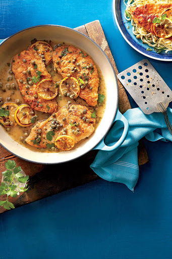 3. Add broth, lemon juice, and capers to skillet. Bring to a boil over high, stirring and scraping bottom of skillet to loosen browned bits. Reduce heat to medium, and simmer, whisking occasionally, 5 minutes. Whisk in remaining 2 tablespoons butter. Whisk in parsley. Spoon sauce over chicken, and serve immediately with pasta.
