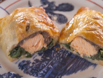 On a lightly floured work surface, roll 1 sheet of the puff pastry into a 12-by-8-inch rectangle, and then cut into quarters. Place a small stack of spinach leaves on the short side of two of the quarters. Top with a salmon fillet and about 2 tablespoons of the mushroom mixture. Brush the pastry edges lightly with egg wash, top with the remaining quarters and crimp the edges. Place the packages on the prepared baking sheet. Repeat with remaining puff pastry sheets and ingredients.