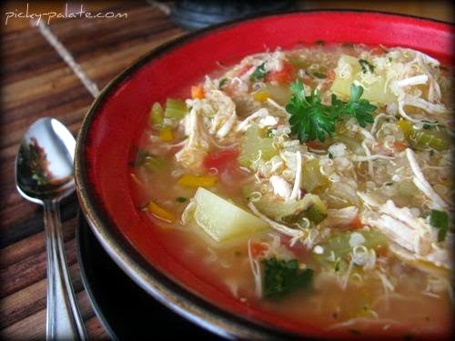 1. Heat oil in a large pot over medium heat. Saute onion, celery, carrots, peppers and zucchini until softened, about 5 minutes. Stir in chicken broth and tomatoes and potatoes. Increase heat to high just until broth starts to boil. Reduce to medium high and cook potatoes for 10 minutes or until fork tender. Reduce heat to low and stir in quinoa, chicken, dijon mustard, hot sauce and season to taste w/ salt, pepper and Lawry’s. Stir in fresh parsley and simmer until ready to serve.