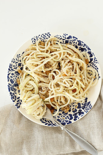 2.Place a large skillet over medium heat and add in the olive oil. Once oil heats, add in the kohlrabi noodles and cook for 2 minutes or until they begin to soften. Then, add in the oregano, pulsed nut mixture, raisins and season with salt and pepper. Cook for 3-5 minutes, stirring constantly to avoid burning the nuts but just enough to fully cook the