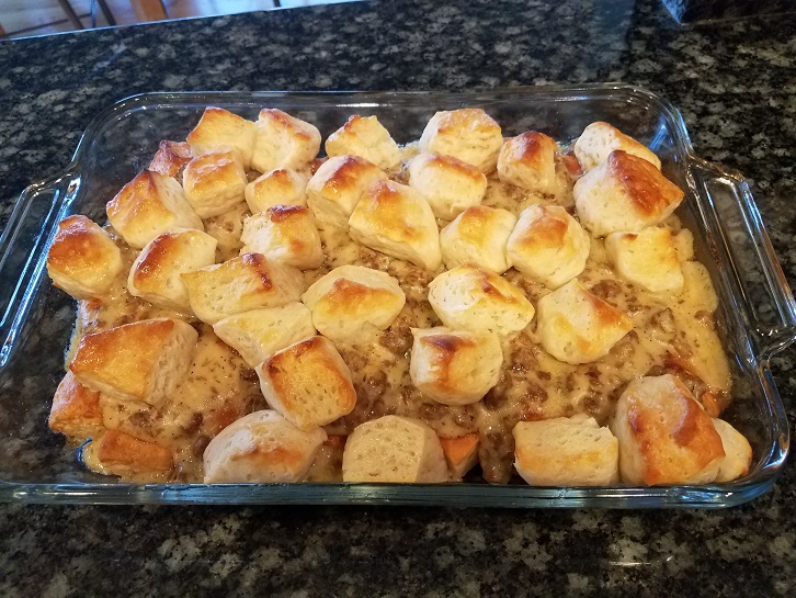 Pour gravy over the first row of Biscuit pieces to cover them. Then put the rest of the Biscuits on top and bake for 10 to 15 minutes (or till the Biscuits are golden brown).