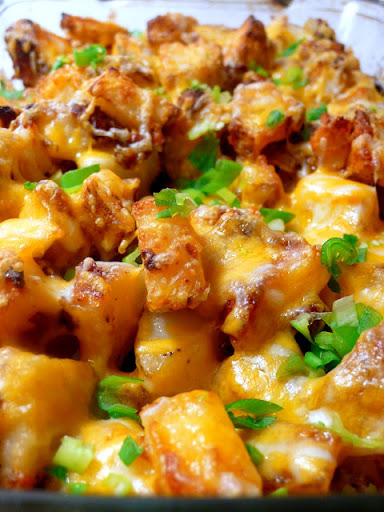 Bake for 60 minutes. Stir gently halfway through to get the bottom potatoes rotated so they don't become burnt and to ensure that the middle and top potatoes get a chance to brown.