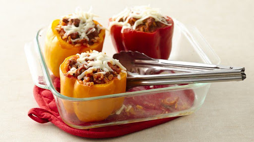 Stuff peppers with beef mixture. Stand peppers upright in ungreased 8-inch square glass baking dish. Pour remaining tomato sauce over peppers.