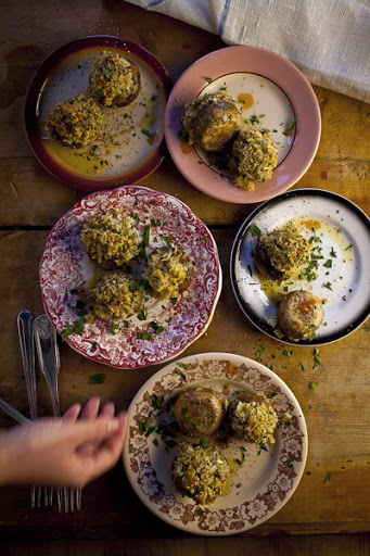 3. Using a spoon, fill mushroom caps with about 3 tbsp. filling and pack tightly. Place filled mushroom caps in a single layer on greased baking dish. Pour remaining wine around mushrooms, and bake until golden, about 30 minutes. Serve warm.