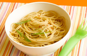 Bring 4 cups of water to a boil in a 1 1/2-quart pot and cook spaghetti according to package directions. When the spaghetti is done, pour it into a colander, rinse, strain well and then place it in a medium-size bowl.